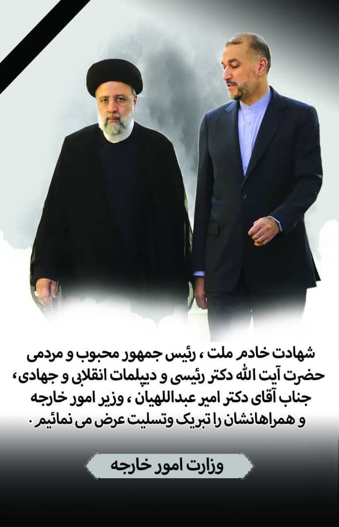 وزارت امور خارجه جمهوری اسلامی ایران شهادت رئیس جمهور محبوب، مردمی و خدوم ملت ایران، دکتر سیدابراهیم رئیسی، دکتر حسین امیرعبداللهیان وزیر امور خارجه و همراهان گرانقدر آنان را به ملت بزرگ و شریف ایران تبریک و تسلیت میگوید.